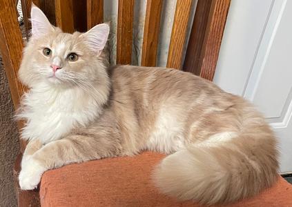MacGyver is 7 months old in photo. Over 12 pounds already. NFC's grow for 4 to 5 years. Big paws. Pleasant. Loves to play. Has sired his first litter. His parents are Vikingtails Ace High Roller Derby & Tordencat Ruby Violet